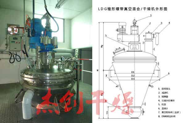 单锥螺带真空干燥机所提供的是一种圆锥形螺带搅拌。整个螺线搅拌桨在自转的同时,螺带将物料不断提升、翻动、刮落,使罐内物料混合均匀并均匀受热。蒸发的溶剂及水蒸气经过滤器除尘后真空系统进行冷凝回收后排放。