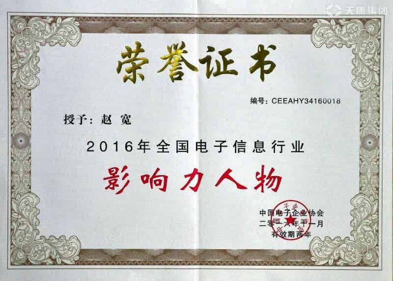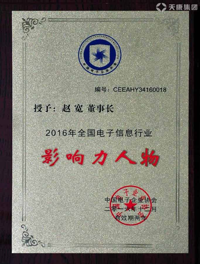 经安徽省工业和信息化委员会推荐、中国电子企业协会初审、专家组评定,安徽天康(集团)股份有限公司董事长赵宽从全国众多优秀企业家中脱颖而出,入选2016年“全国电子信息行业优秀企业家”之“行业影响力人物”,全国获此殊荣仅有18人。此次全国电子信息行业优秀企业家评选共分为“行业影响力人物”、“杰出企业家”、“创新典范”、“最具社会责任奖”、“最具成长价值奖”、“优秀企业家”等六项。相比其他五项,“行业影响力人物”要求更为严格,入选人员也最少。