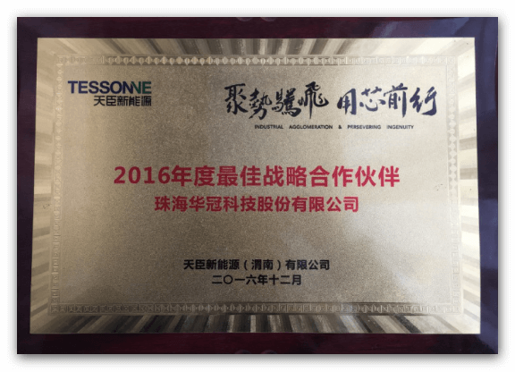 在刚刚召开的天臣新能源(渭南)有限公司动力电池发展交流暨2017年度供应商大会上,华冠科技从众多供应商中脱颖而出,被评为2016年度天臣新能源的“最佳战略合作伙伴”!