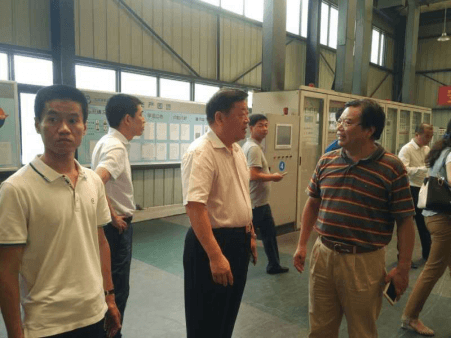刘玉成师长(中)在公司副董事长唐世国(右一)陪同下参观公司生产线