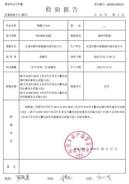动力电芯产品已通过GB/T 31484、GB/T 31485、GB/T 31486、UL1642、UN38.3、QC/T 743、RoHS、REACH认证