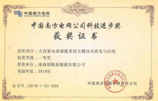 2017年1月,银隆新能源出席2016年度广东省科学技术奖评审委员会工作会议。喜获2016年广东省科技二等奖,银隆新能源作为项目参与方喜获2016年度中国南方电网公司科技进步一等奖。