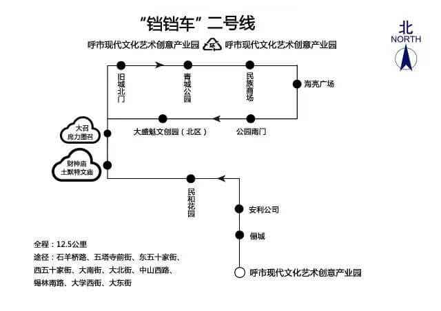 沿途设站:呼市现代文化艺术创意产业园、俪城、安利公司、民和花园、财神庙(土默特文庙)、大召(席力图召)、旧城北门、青城公园、民族商场、海亮广场、公园南门、大盛魁文创园(北区)、大召(席力图召)、财神庙(土默特文庙)、呼市现代文化艺术创意产业园、俪城、安利公司。