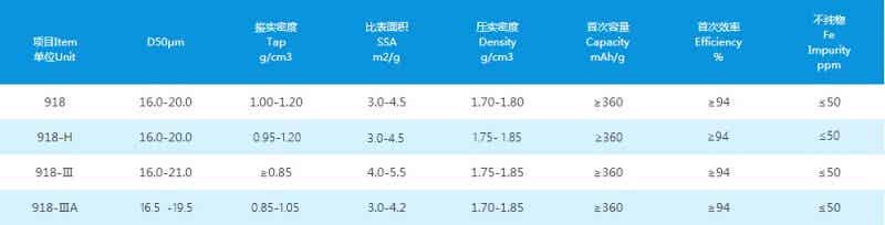 高能量密度 长寿命 简单化(不需添加导电剂) 该系列产品适合于高端方形、聚合物及圆柱锂离子电池。 ![]()