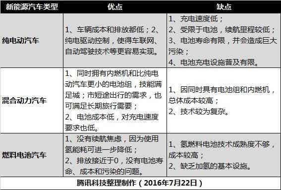 新能源汽车主要分为纯电动汽车、混合动力汽车与燃料电池汽车三类,这三类汽车的主要优缺点如下:
