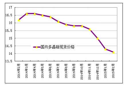 2015年1-2月份我国多晶硅价格缓慢微幅下滑,从1月初的14.44万元/吨下滑到2月中旬的14.09万元/吨,降幅为2.4%,进入春节后,受假期人员调休及物流等因素影响,多晶硅料少有成交,14.09万元/吨的价格一直维持到2月底。