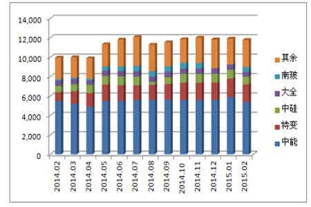 硅业分会统计,2015年1-2月份国内多晶硅产量为2.37万吨,1月份产量为1.19万吨,2月份产量为1.18万吨,其中江苏中能的产量占国内1-2月份总产量的48%,依旧位居国内产量第一位,特变电工和洛阳中硅分别居第二、三位,1-2月份前三大企业产量占总产量的70.4%。1月份国内有3家企业停产检修,2月份全部恢复生产,目前17家在产企业中,开工率达到100%的企业有7家,其余企业也生产稳定,江苏中能和特变电工均为超负荷运行,进一步降低了成本,提高了效益。