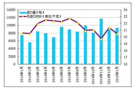 图3 2014年1月-2015年1月多晶硅进口量及进口均价示意图