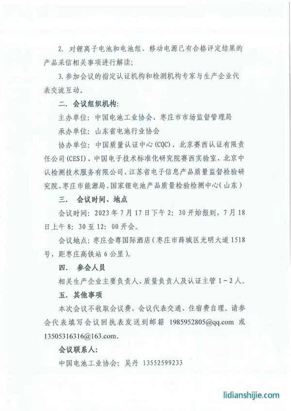 关于召开锂离子电池和电池组、移动电源强制性产品认证相关要求宣贯会的通知 2023-07-05 821720 核心提示:下载附件:参会回执表.docx作者:中国电池工业协会 下载附件: 参会回执表.docx 作者:中国电池工业协会 点赞 0举报收藏 0打赏 0评论 0分享 82 更多>同类锂电资讯 • 奔驰正加速推进电动车固态电池上车进程 • 磷酸铁锂电池渐成市场主力 • 迷之碳酸锂库存 • 锂电产业链周记 | 宁德时代联手五大车企发布10 • 天能发布全新驻车锂电池产品 • 中力再生锂电叉车成汽车零部件企业降本增效“新 • 德意军火巨头向菲律宾出售先进锂电潜艇 • 广东首个“飞轮+锂电”混合新型储能电站落户广 • 美国关税对于锂电产业链的影响 • 石墨为什么会成为美国加征关税中豁免的品种?