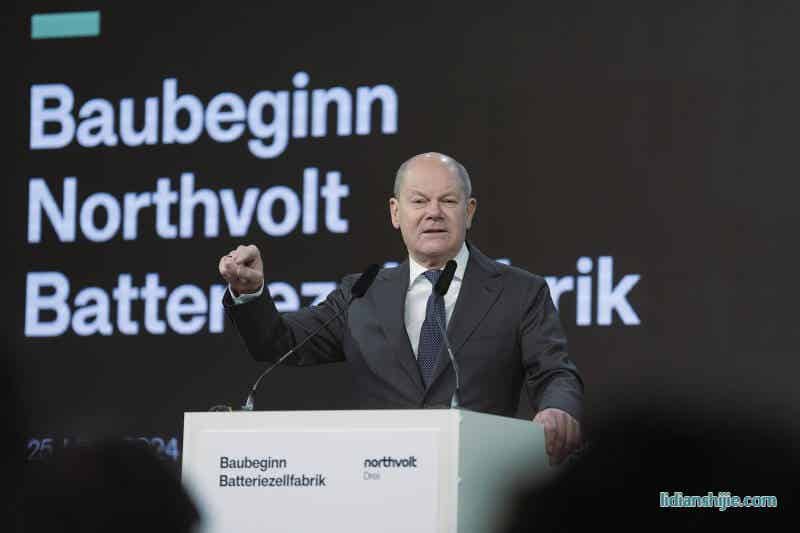 当地时间2024年3月25日,德国石勒苏益格-荷尔斯泰因州,德国总理奥拉夫·朔尔茨在Northvolt工厂建设开始前发表讲话。德国总理肖尔茨和经济部长哈贝克出席了Northvolt工厂的正式开工仪式,该工厂将从2026年开始生产电动汽车用电池。 视觉中国 图