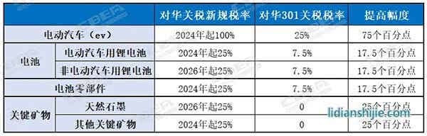 值得注意的是,上述税率落地有2个时间节点,按其时间顺序,2024年起,美国政府先将中国电动汽车关税税率从原来的25%提高至100%;电动汽车用锂电池及其零部件关税税率从原来的7.5%提高至25%;除天然石墨外,其他关键矿物关税税率从0提高至25%。
