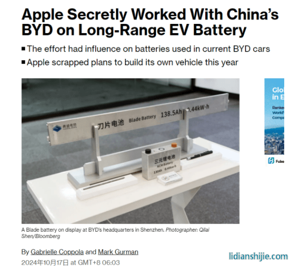 美东时间10月16日,彭博社报道援引知情人士的消息称,苹果与比亚迪于2017年开始合作,联手开发长续航里程的电动汽车电池,这一研发为比亚迪汽车目前所采用电池的技术奠定了基础。