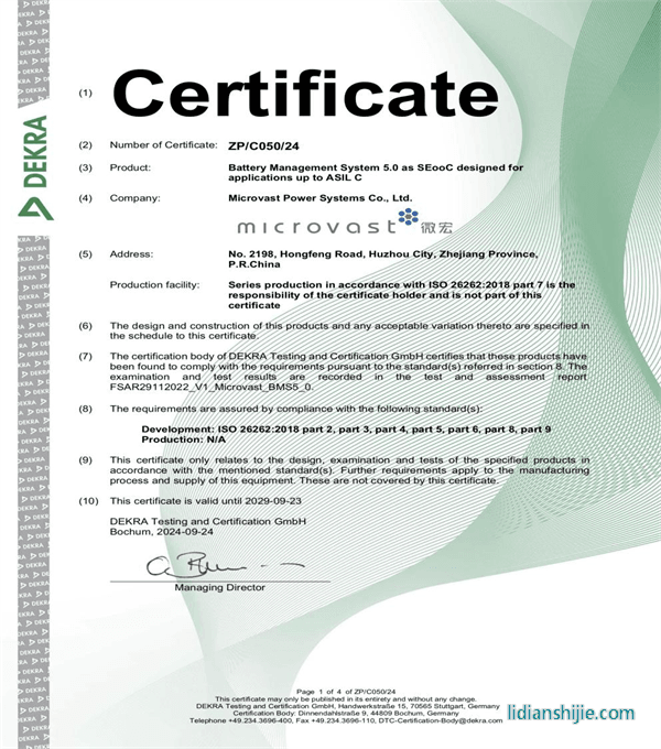 微宏动力第五代BMS产品获DEKRA德凯ISO 26262:2018汽车功能安全ASIL C产品认证证书