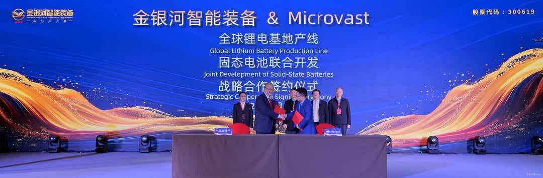 在科技大会上,金银河与Microvast微宏集团签订“全球锂电基地产线和固态电池联合开发”战略合作协议,双方将展开深度合作,携手共绘全球合作和固态电池开发的新编章。