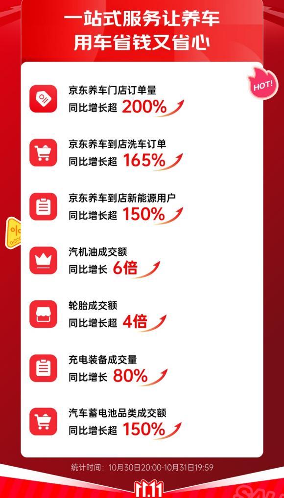 10月30日晚8点至31日晚8点,京东汽车11.11在“补上加补 至高省千元”的加持下,凭借“又好又便宜”的产品与一站式服务体验,交出了一份亮眼的增长答卷,机油成交额同比增长6倍、轮胎成交额同比增长超4倍。