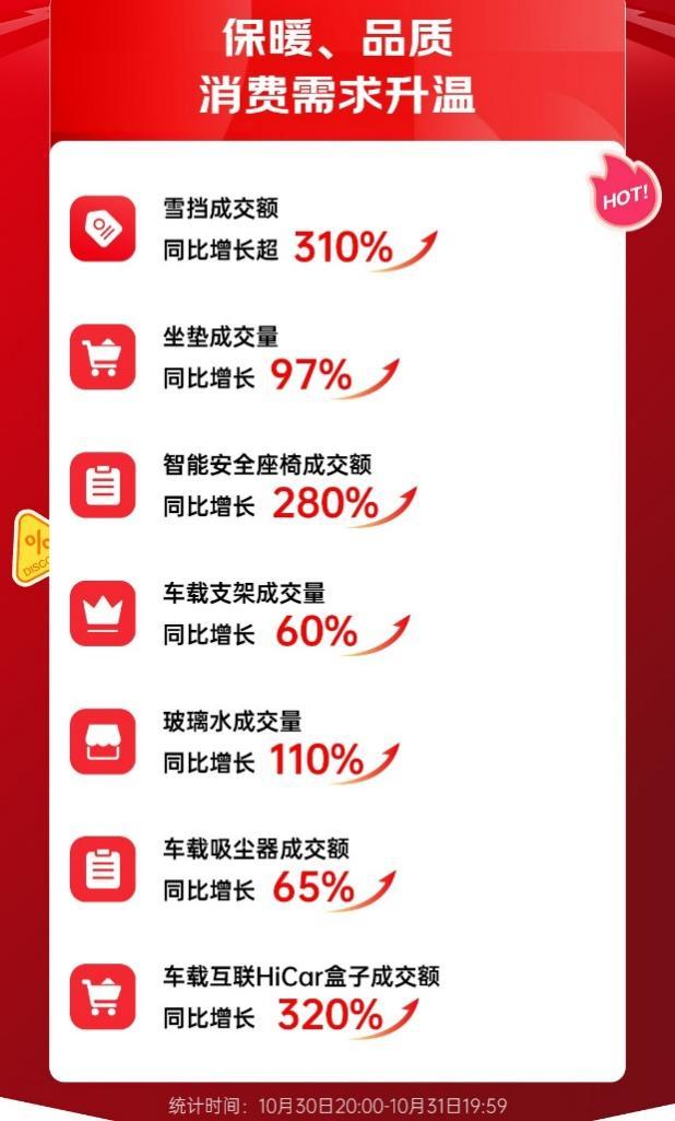 随着气温下降,冬季保暖需求迅速升温,雪挡成交额同比增长超310%,坐垫成交量同比增长97%,智能安全座椅成交额同比增长280%。用户品质需求带动车载好物热销,车载支架成交量同比增长60%,车载吸尘器成交额同比增长65%,车载互联HiCar盒子成交额同比增长320%。玻璃水成交量也同比增长110%。