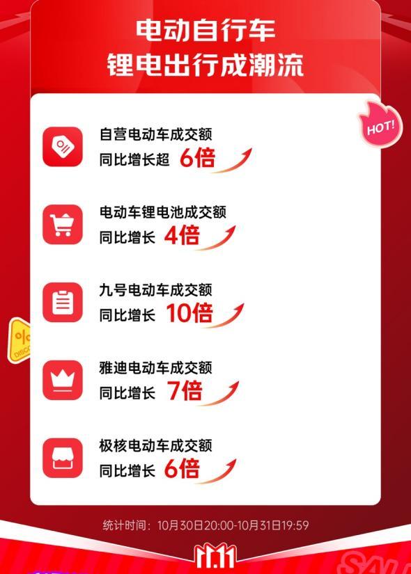 短途出行领域,锂电加持的绿色出行方式愈发受消费者青睐。京东11.11自营电动车成交额同比增长超6倍,电动车锂电池成交额同比增长4倍。九号、雅迪、极核三个品牌成交额分别实现10倍、7倍、6倍的同比增长,为城市短途通勤注入新活力。