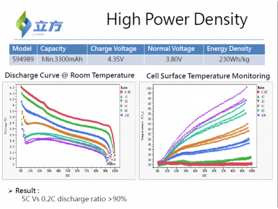 目前正在开发的无人机电池可支持≥5C持续放电,能量密度高达230瓦时每公斤,5C放电温升小于35℃ 湖南立方新能源科技有限责任公司开发和生产的高功率型聚合物锂离子电池具有:功率密度高且能量密度适中,循环寿命长,安全可靠,高温存储性能好,低温放电能力强,性价比高,制造工艺拥有自主知识产权等特色。
